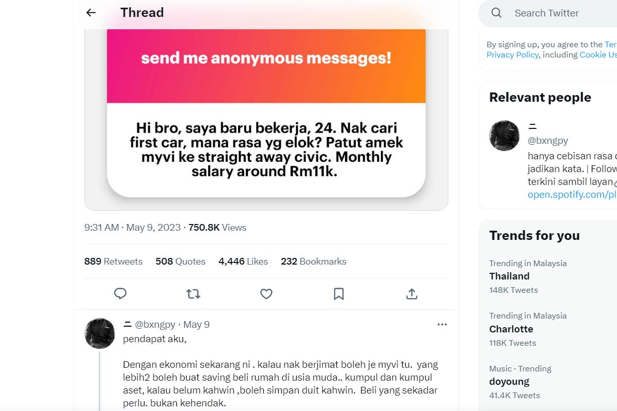 根据他匿名向博主求教的信息,他表示目前他刚刚开始工作,今年 24 岁而已,想要买人生中的第一辆车,询问网友们的意见哪一款比较好,是要买 Perodua Myvi 或是直接升级到 Honda Civic,而他的月收入大约在 RM 11,000 左右。
