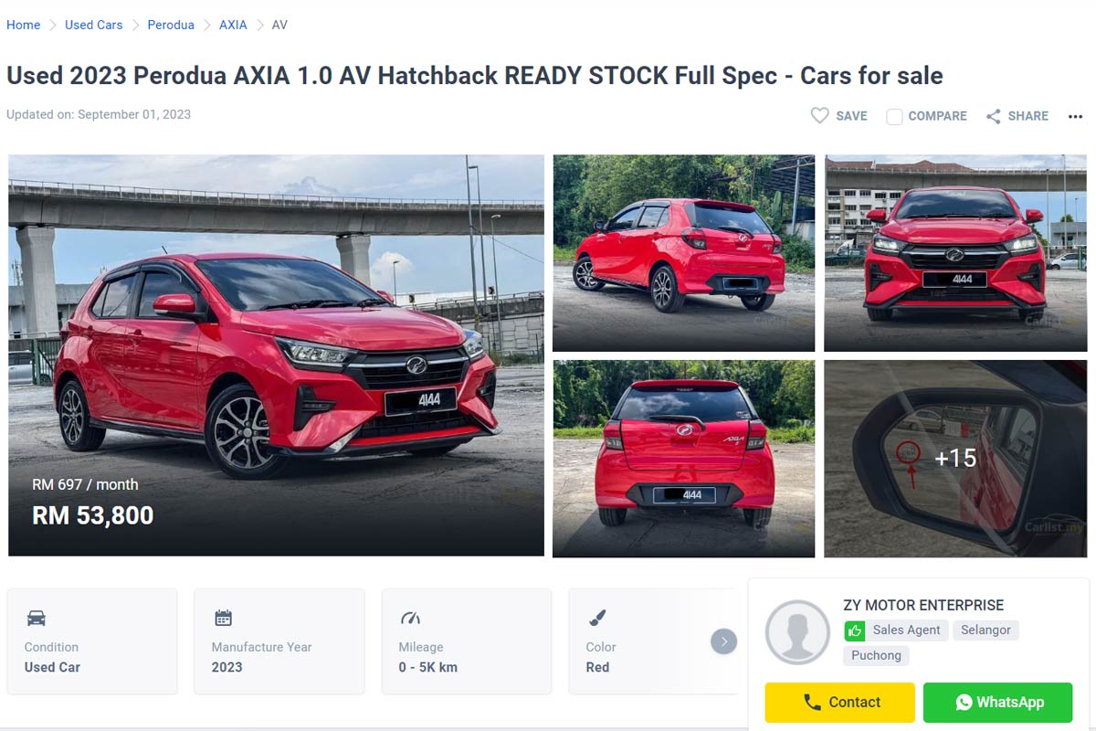 比新车还贵!二手 2023 Perodua Axia,里程 5,000 km,开价 RM 53,800 出售。