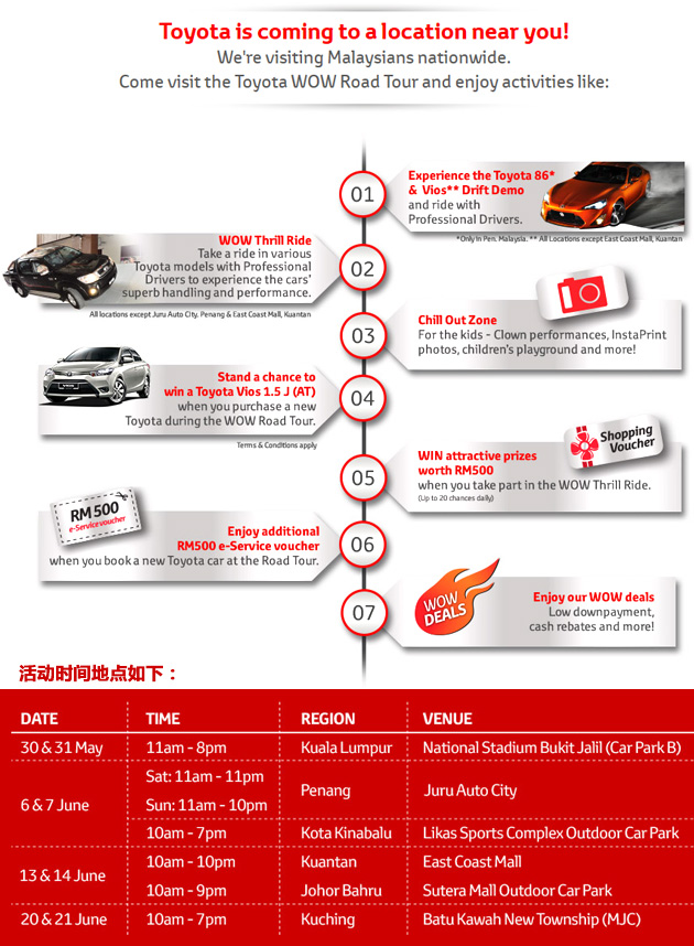 Toyota将会从5月30日起至6月21日在全国6个地点展TOYOTA WOW ROAD TOUR活动,在活动中将会有特技表演,也有专人设计的路线让民众以Toyota车款来征服这些特殊的路线。每天将会有20份价值RM500的礼券送给参与试驾的幸运民众,除此之外还有100台Ipad mini和200台Iphone6 Plus供赢取!