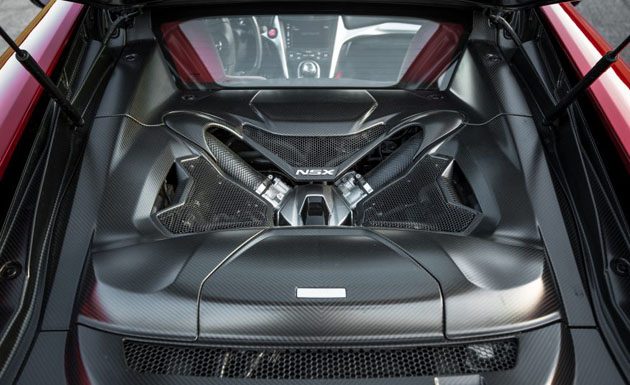 NSX上搭载的引擎是一具排气量为3.5L的V6双涡轮增压引擎,其中气缸夹角为75度,并且采用双置顶凸轮轴的设计,在引擎上的最大马力为500 hp(结合电动马达后的总效马力为573 hp)峰值扭力550 Nm,可见NSX加速强劲的原因还是在这具引擎上。两代NSX的引擎最大的差异就是排气量更大还有从自然进气变成涡轮增压,同时还包含了目前主流的缸内直喷技术等等,因此这具引擎可说是完全整合了Honda最为先进的技术了。