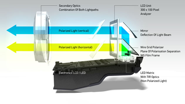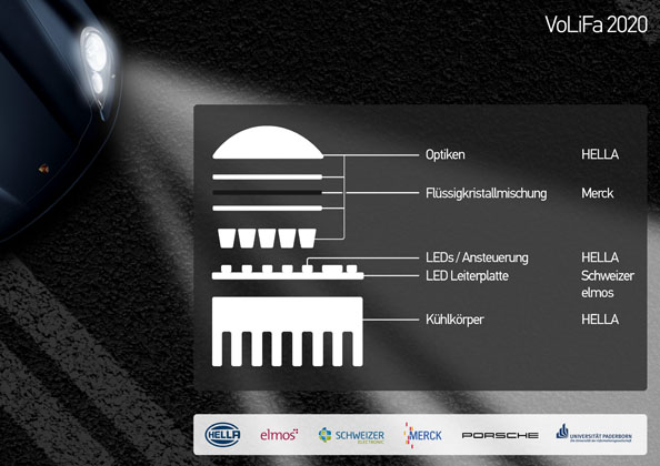 不久前Hella宣布和合作伙伴默克公司,斯图加特大学,Porsche,Elmos半导体,Schweize电子帕德博恩大学等等开发出一种基于LCD的头灯,这个项目是由德国联邦教育与研究部(BMBF)所资助,LCD头灯组被看作是比镭射头灯组还要先进的技术,厂商也希望这个是未来全球的车坛的未来,这项技术的推出也代表着就连汽车的照射技术都开始迈向了数位化。