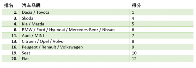 故障率是我国车主最为在乎的一环,可以看见的是德国人对Renault-Nissan联盟旗下的廉价品牌Dacia,以及江湖传言最耐操的Toyota的故障率最为满意,Dacia少故障估计是因为构造简单吧!至于Toyota的口碑看来真的不是浪得虚名啊!排在最后的为Fiat,这个品牌的故障率之高看来也不是浪得虚名的,科科。