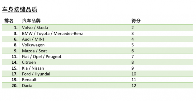至于在车身品质及内装品质方面,Volvo众望所归都拿下了第一名,让人惊讶的是Skoda竟然打败其他包括BBA等的豪车品牌同样在车身品质方面和Volvo共享第一,连自家母品牌Volkswagen都排在第8罢了。至于内装品质方面,除了实至名归的冠军Volvo(这品牌使用的是环保用料并非常讲究材质)以外,所有德系品牌(包括子品牌)都包办了前面的排名,直到第9名才被日系的Mazda拿下,韩国代表Hyundai及Kia紧追在后,而Toyota和Nissan只能排在第14名。