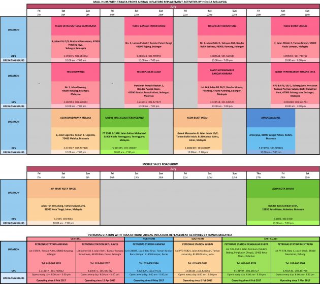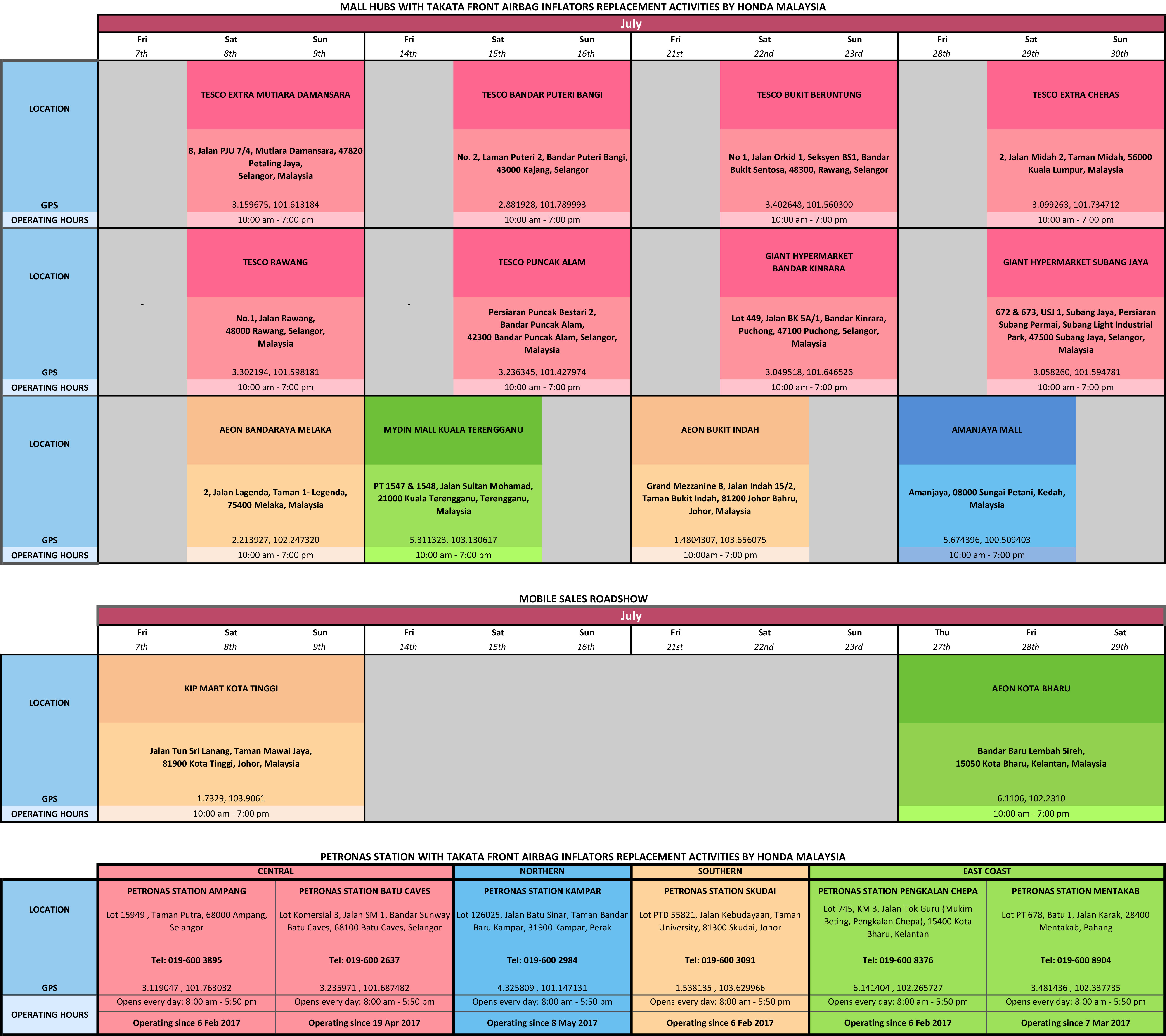 目前Honda Malaysia依旧在不同的购物中心设立移动维修点,受影响的车主可以在以下的地点更换气囊组件: