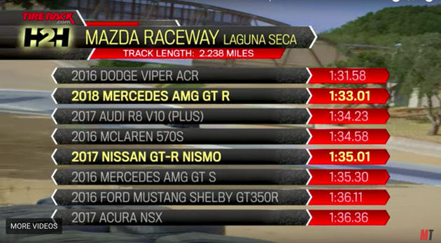 Nissan GTR35 自登场以来战胜了全球不少知名超跑所以有着超跑杀手之称,不过它似乎也遇上了对手!近日美国媒体Motor Trend就找来了R35 Nismo还有来自德国的AMG GTR做一场同场较量,或许是年事已高在这场较量中R35以2秒的差距的成绩输给了AMG GTR!