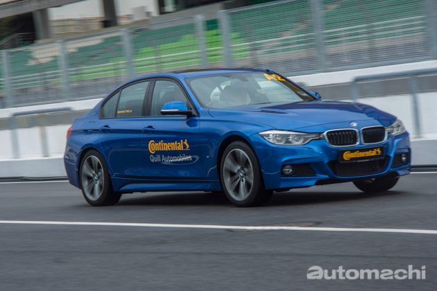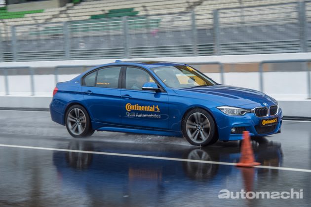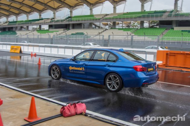 第一环节湿地刹车,主要就是因为MC6上有自适应抓地配方(Adaptive Grip Conpound)所以在湿地的刹车表现会比起MC5还好,在现场原厂准备了装备MC5和MC6的330e让我们测试,首先我驾驶着装备MC6的330e以大油门出车,之后在时速80的时候紧急刹车,根据车上的专门仪器出来的结果在时速80下装备MC6的330e只需要18.2米的距离就可以完全静止,之后我以同样的测试方法来测试MC5,结果MC5需要22米的距离才可以完全的静止,4米的距离几乎就是一辆Honda Jazz的车长了,所以证明了MC6在湿地刹车上是有非常显著的进步。另外一点就是在大油门出车的时候其实可以感受到装备MC5的330e在后轮其实有点hold不住了,车尾会有左右摇晃的情况出现,所以在抓地力这一环MC6表现的非常不错!