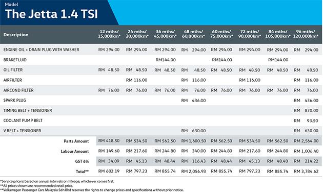 首先,在保养费用方面,由于小编的Jetta拥有原厂5年的保固期,因此我都选择送回原厂进行保养,而根据官方列出的保养时间表,TSI引擎的保养期限为每15,000公里又或者是1年期限就必须进行机油更换等等的例常保养(视何者为先),普通的保养费用一次介于600-800令吉左右,而全合成Castrol机油加上滤油器的价钱为350令吉左右,人工费一小时为100多令吉,通常都只算一小时,至于剩下的费用就是一些你可以选择不要的选项,比如空调过滤网以及雨刷精等较为不重要的配件更换。