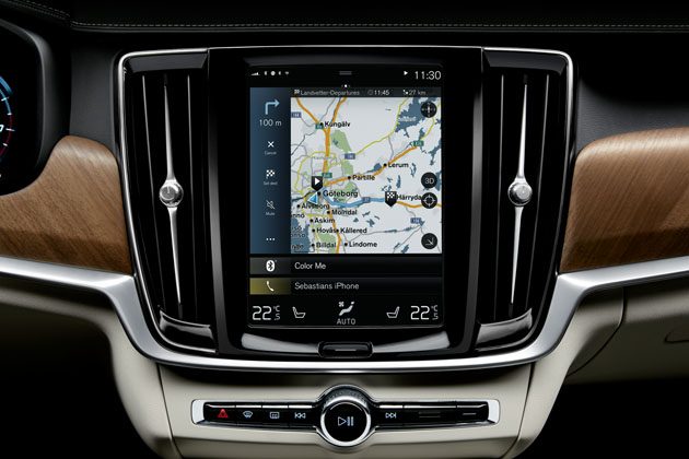 出了在引擎动力十分出色外,Volvo S90 T8的内装配置同样也是非常的出色,在排档杆你可以看到T8版本专用的水晶排档杆,同时在中控台的中央有一个很像Ipad的大型触屏主机,在这个主机可以完成绝大多数的操作,包括了冷气的风量调整,温度调整,主动安全配备的开关,驾驶者使用手则还有基本的娱乐功能都在这里找得到,所以整个中控台的界面是非常的简洁的,几乎找不到任何多余的控制键。
