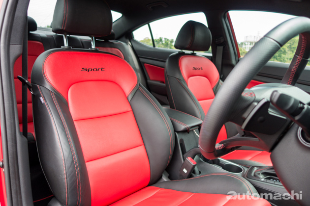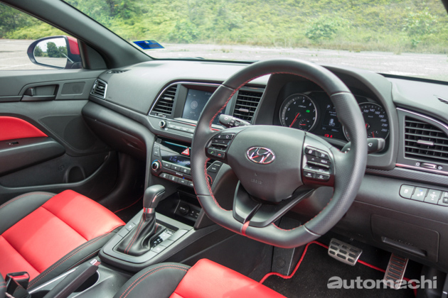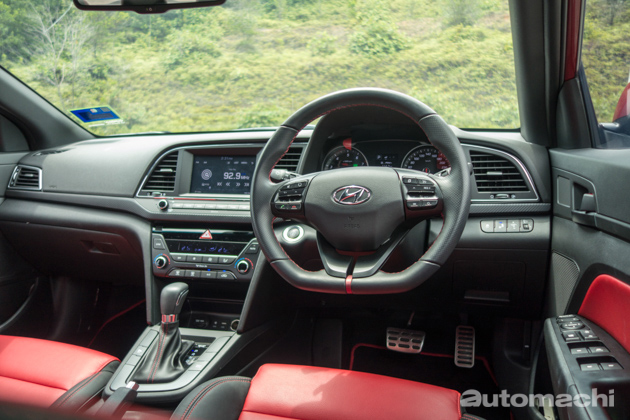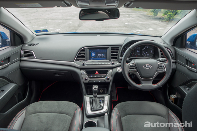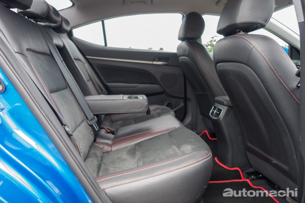 不过来到内装,我个人就有点失望了,虽然 Elantra 的内装品质还算不错,不过在整体设计与质感上比起同级对手都稍微逊色了一些,但大致上可以说该有的还是都有,包括备有各种资讯显示的仪表盘,以及大尺寸的资讯娱乐主机,当中1.6L Sport版本的音响系统还算不错;不过有一点小编想吐槽的是,或许为了体现运动风格,除了黑色的顶棚以外,原厂还为1.6L Sport配置了红黑双色的皮革座椅,虽然质感很好可是小编个人觉得红色的部分有点太多了,整体看起来似乎有点“海鲜”味(什么意思你懂的~),反而2.0L版本的全黑皮革混搭类似Alcantara翻毛皮的材质更显质感;不过1.6L的平底方向盘就值得称赞,除了握感不错以外设计也挺好看的,而且还配有非常好用的换档拨片。另外,1.6L Sport 版本备有双区恒温空调系统,而2.0L 版本则是普通不带自动功能的空调系统,连调节都是采用旋钮设计。至于内装空间,Elantra在这方面的表现以C-Segment来说可用绰绰有余来形容,后座及尾箱空间也绝对足够。