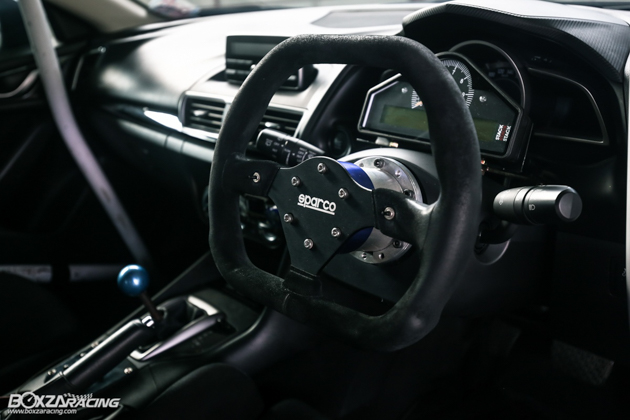 内装部分,由于在移植了4G63T后车身架构强度并不足以应付多出的马力,因此车主直接套上了全套的防滚架,在提高车身刚性之余也多少对行车安全有所帮助。另外,由于移植了4G引擎后 Mazda3 原本漂亮的炮筒式仪表盘并不能兼容,因此车主只能替换成 Stack ST8100 的仪表盘,看了非常有赛车式样的感觉,加上Racetech RT4009HR的桶椅、Sparco 310方向盘以及手排波棍,整个内室的氛围只能用非常热血来形容!