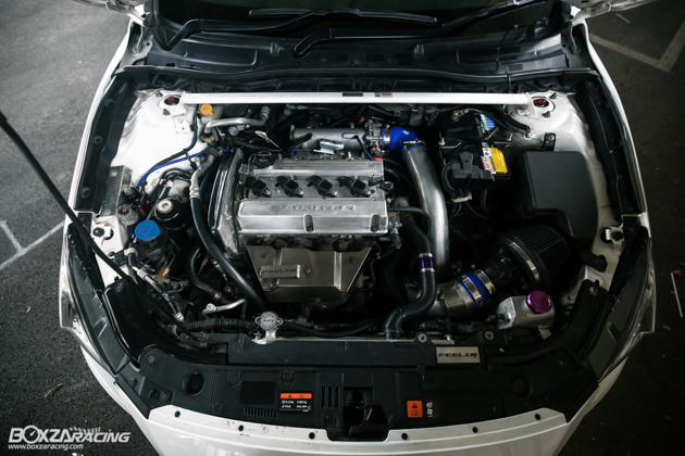 与低调的外观不一样,一打开引擎盖就可以看见这辆 Mazda3 非常亮眼的重点:源自 Mitsubishi Evolution VII 七代芦笋的 4G63T 涡轮增压引擎!不过看来车主真的很低调,因为他竟然将这具一代名机最为标志性的红色 rocket cover 漆上了朴实的银色;动力改装方面,车主选择套用回原装 EVO七代的ECU行车电脑,同时将引擎内部进行强化,换上一系列的锻造套件,最终这具 4G63T 在这辆 Mazda3 里被调教至拥有 400hp 轮上马力的境界!