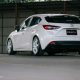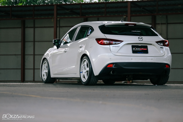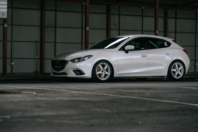 在外观上这辆白色的 Mazda3 Hatchback 可说十分地原装,由车头至车尾都没有任何改变,可说非常地低调,相信许多人都会认为是原装车,连警察叔叔都不会多看这辆Mazda3一眼。而唯一与原装车最明显不一样的相信就是白色的 Enkei 轮圈,以及藏在轮圈内的金黄色 Brembo 四活塞刹车卡钳了!此外,为了进一步强化操控,车主也换上了 GAB SS 高低软硬可调式避震器,在降低车身高度之余也提升了过弯表现。