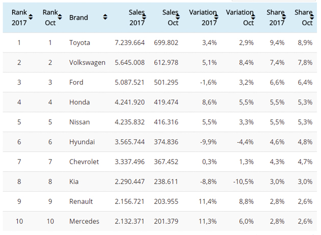 以下为Focus2Move 2017年度10大汽车品牌排名: