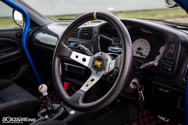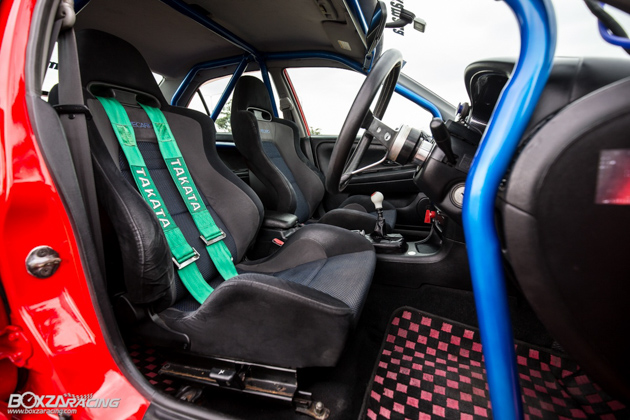 拥有了如此煞气的外观,内装方面自然也不能怠慢;一打开车门就可以看见 OMP 的赛车方向盘,后方还有GReddy Profec 涡轮压力表,可调节涡轮的增压值;此外蓝色的多点式防滚笼格外亮眼之余,也大大提升了操控质感及安全系数 ,加上一对 EVO 7 的原装 Recaro 赛车桶椅,以及青色的TAKATA安全带,令整个车厢看起来异常热血,大大提升了战斗格!看了这辆改装得很干净的5代“芦笋”,令小编突然也很想要一辆 EVO 来过过童年瘾了!