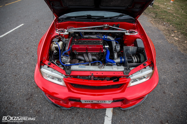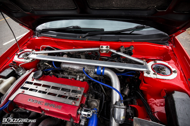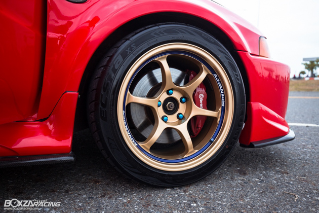 为了应付额外的马力,车主也升级了HKS Kansai的避震器,加上前后的 Ralliart 拉杆,而制动系统则沿用原来的 Brembo 刹车钳,车主表示足以应付。车主也选用了17寸的 Advan RG 经典金色轮圈搭配 Kumho Ecsta XS KU36 性能胎作为这辆一代街霸的跑鞋。