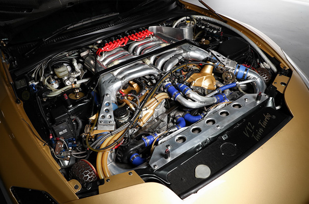 这辆金色的四代JZA80 Toyota Supra 之所以被誉为传说,除了因为它猛爆的性能表现以外当然也是因为它传奇的故事;首先这辆由 Top Secret 社长永田和彥(Kazuhiko Nagata)所打造的牛魔王原装搭载的一代名机2JZ-GTE一开始就被舍弃,改而采用源自有”日本Rolls Royce“之称的 Toyota Century 所搭载的5.0L V12引擎,当然这具代号为1GZ-FE的引擎在Smokey社长手上怎么可能会以原装姿态出现,他先后加装了一对HKS GT 2835大涡轮,以及NOS氮气喷射系统,通过6速手排的设定一共榨出了疯狂的943hp的最大马力及高达1010Nm的峰值扭力!