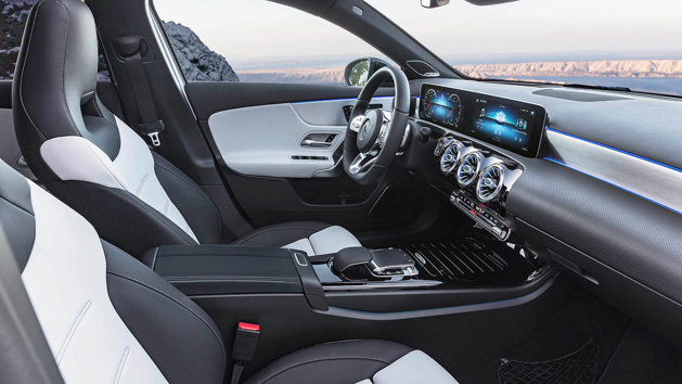 与外观不一样,新一代 A-Class 的内装可说是进行了完全的大改造,新一代 A-Class 的仪表板采用了新一代的家族设计风格,除了全新的方向盘设计,更继承了源自 S-Class 的双12.3寸大型液晶荧幕设定,除了备有数位化仪表,新 A-Class 更是首款采用原厂最新一代的 MBUX 资讯娱乐系统的 Mercedes 车型,此外中控台上还有沿自 E-Class Coupe 的涡轮叶片空调出风口,而且还内附氛围灯,将车室氛围带到更高的一个层次;除了更为精致的设计,新车的内装也会选用更优质的材料以提升座舱质感,将 A-Class 的竞争力带到另一个层次。