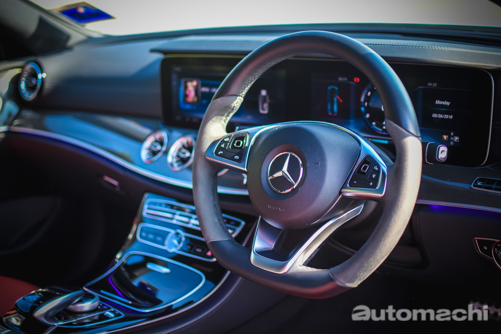 如果从外观来评论 E300 Coupe Edition 1 的话他真的是非常的帅气,而且车辆采用了哑色车漆看起来非常的特别,在试驾的期间有不少人问我你的车去粘这个镀膜花了多少钱,但是当我告诉他们的这个是原装的很多人还是表示不相信。在车身的细节上 E300 Coupe Edition 1 其实和一般的 E Coupe 是大同小异的,首先你可以看到 MultiBeam 的LED头灯组带着蓝色的元素,同时有两个很显眼的LED光条,至于尾部虽然同样是采用了LED,但是因为设计的关系看起来有点像是时下流行的OLED灯组,辨识度很高,而这台车最让我惊讶的是轮圈的配备,因为尺寸达到了20寸,而厚度更只有30,可说是完全运动化的配置。
