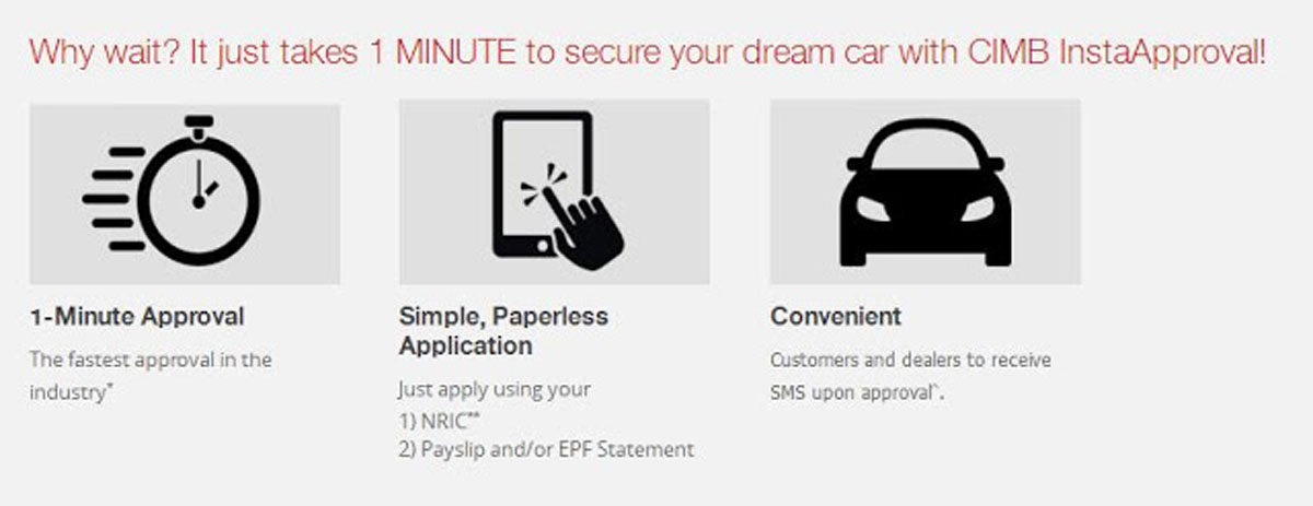 1-Minute Auto Financing InstaApproval 是 CIMB的InstaApproval™ 系列的成员,在你准备好你的文件与资料后只需要提交到这个平台,系统只需要一分钟就可以让你知道你的贷款是不是获得批准。在之前贷款批准最快也要1天,而甚至有一些准车主需要一个月才知道所申请的汽车贷款有没有办法通过,所以在 1-Minute Auto Financing InstaApproval 推介之后可以节省申请贷款者的时间!