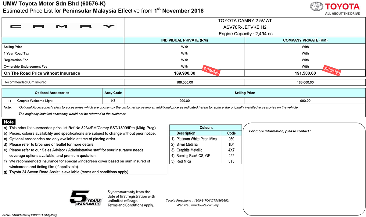 我国正式发表 Toyota Camry 2018 ,预售价 RM 189,900 !
