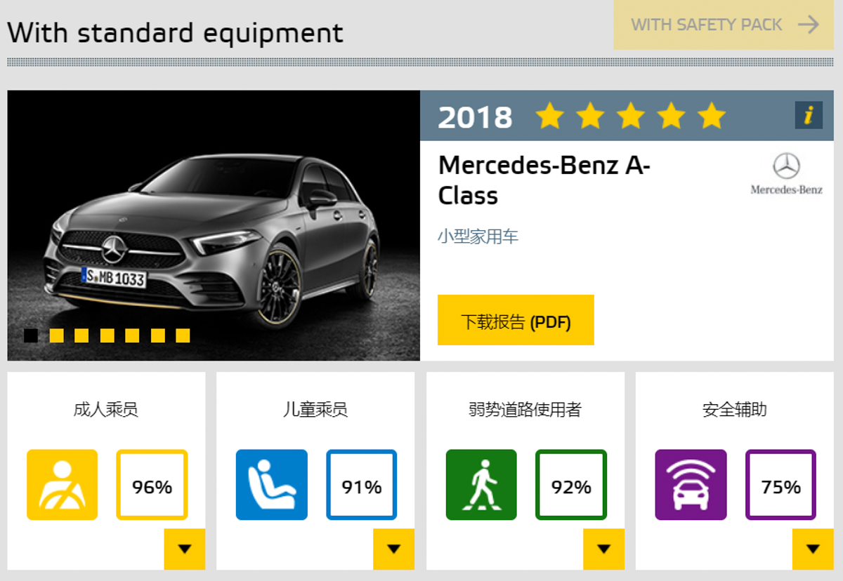 欧盟的 Euro NCAP 是透过四大评估项目:成人乘员、儿童乘员、行人及安全辅助进行评级,其中同级距中得分最高的车款就能获颁成为最佳车型。值得一提的是, 为了公平起见,所有测试车型皆是以标配的安全配备来进行评级,并不包括选配的额外安全配备在内。其中在小型车款中全新的 2018 Mercedes-Benz A-Class 在这四大项目中表现优越,分别在成人乘客保护率、儿童乘客保护率以及行人保护率获得了分别为96%、91%及92%的超高分,而在安全系统辅助项目中也获得了75%,整体表现可说是非常出色。