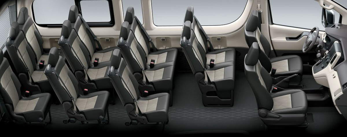 车身尺寸方面,菲律宾的 Hiace 与泰规版一样共有两种身形,其中普通版的 Commuter Deluxe 以及 GL Grandia 的尺寸为 5,625 mm x 1,950 mm x 1,990 mm,轴距则是3,210 mm,比起上一代车型“长大”了不少;至于更大的 GL Grandia Tourer 则是 5,915 mm x 1,950 mm x 2,280 mm,轴距则达到惊人的3,860 mm。商用的 Commuter Deluxe 备有15个座位,而较为豪华的 GL Grandia 则是12座位的设定,而身形大不少的 GL Grandia Tourer 则可载14人。值得一提的是,在菲律宾 Hiace 的主要对手其实就是我们这里熟悉的 Hyundai Starex 。