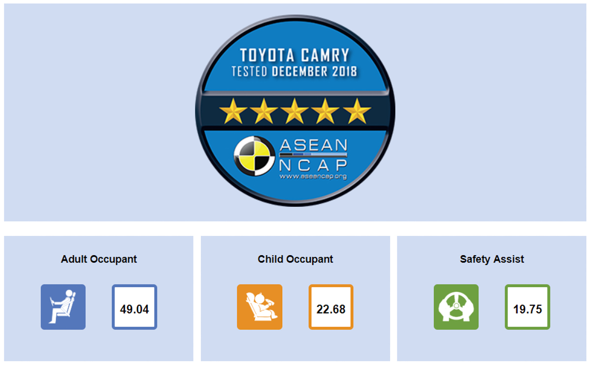 在 Asean NCAP 的测试中测试项目主要包括了成人撞击防护,儿童撞击防护和先进安全配备测试,而每一项的测试又分成很多的细部测试,其中先进安全配备测试是在2017年才引进的测试项目。其中,在成人撞击防护项目中 Camry XV70 就获得了49.04的超高分,只差1分就可以拿下满分了;至于在儿童撞击防护项目中则获得了22.68分(满分为25分),值得一提的是在这个项目中,Camry XV70 的前方与侧面碰撞测试皆获得了满分,表现出色。