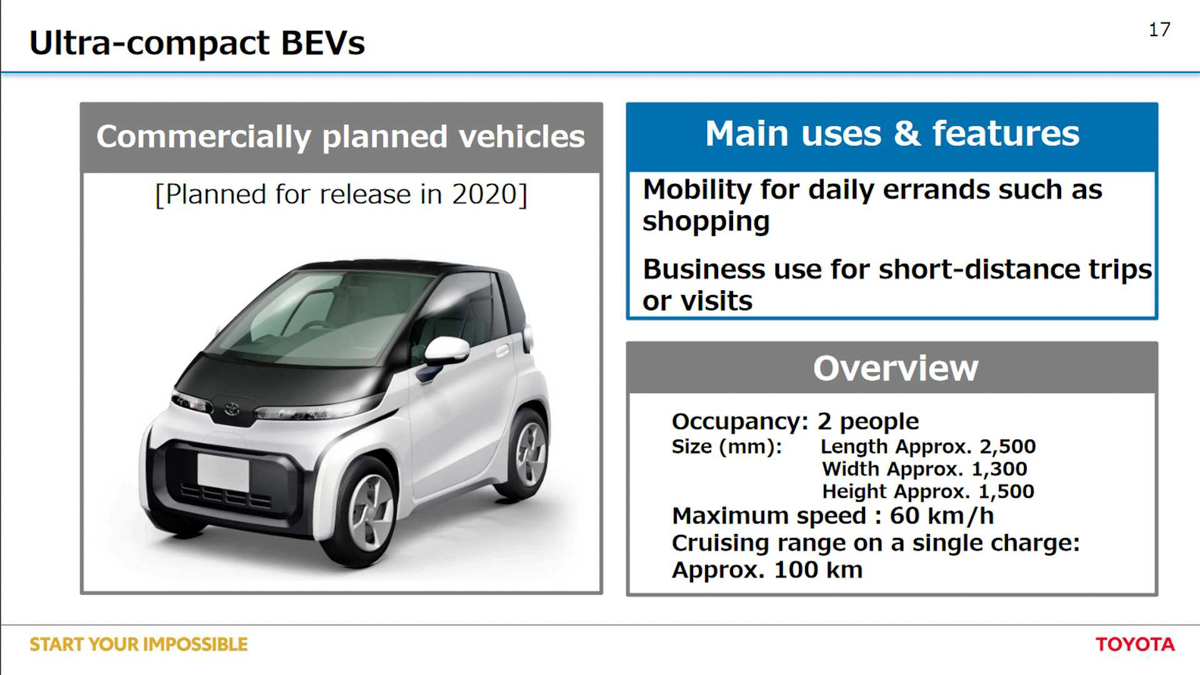 为了展开这项计划,Toyota 将在明年率先推出早前已经在上海车展发布的 Toyota C-HR BEV 及 Toyota Izoa BEV 这两款孪生电动汽车,而接下来还会推出一款专为日本市场打造的双人座小型 EV 电动车,这款都会代步小车拥有轻量化的铝合金车身,电动马达搭配电池模组后拥有2 W的输出功率,在100 V的电力下仅需3小时就能充满电,最高时速可达到60 km/h,续航能力为50 km。