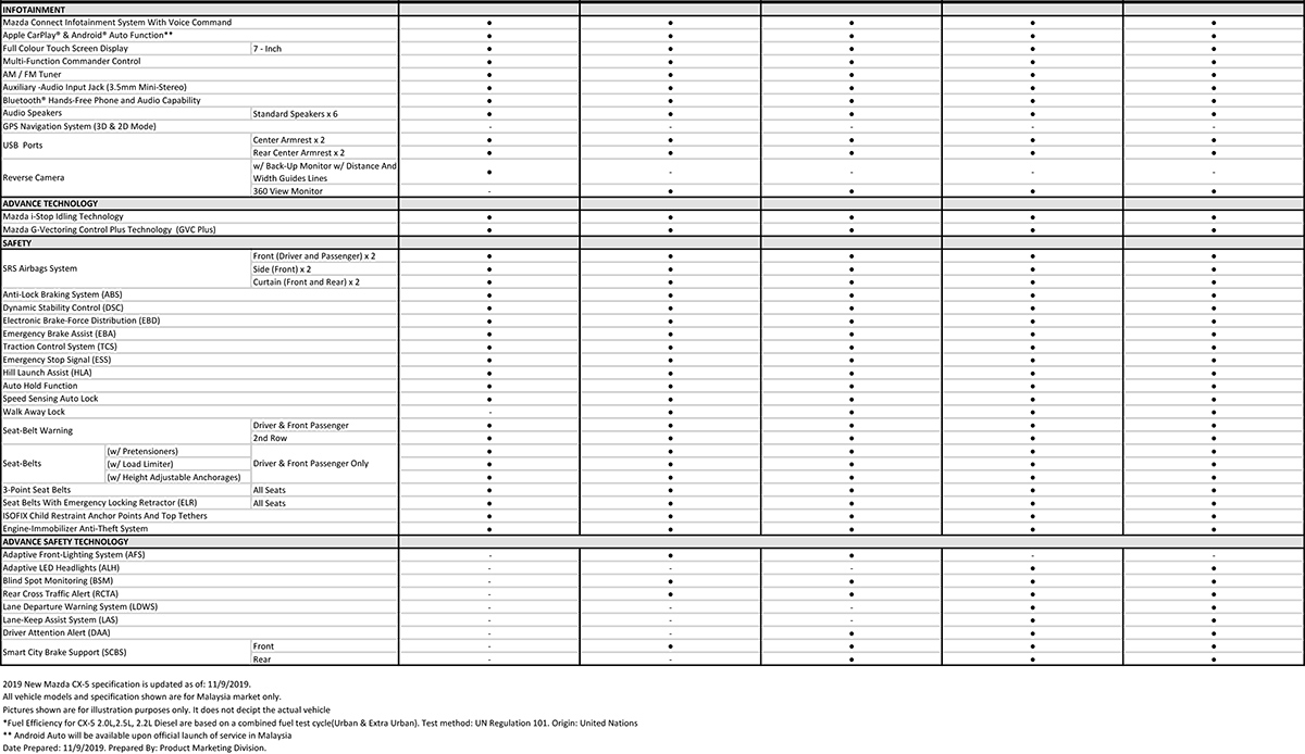 在价格方面,最入门的 2.0 GL 较为特别,因为在这当中 Arctic White 单色漆(Solid Paint)的预售价格为 RM 134,721 ,至于选择其他车身颜色则要价 RM 138,500.20。以下为 2019 CX-5 完整车系的预计价格: