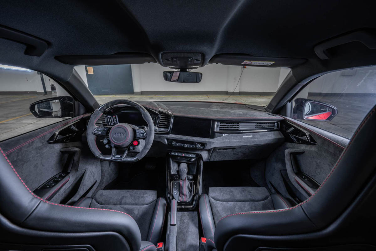 至于内装部分,ABT 采用了大量的 Alcantara 材质,而大家也可以看到这辆 A1 Sportback 的后座已被移除,并装上了赛车防滚架(Roll Cage),加上备有 One of One 字眼的赛车桶椅,让 A1 Sportback 的内装充满着满满的战斗气息!不过重点还是在动力配置上,A1 Sportback 所搭载的 2.0L TFSI 涡轮增压引擎最大马力为 231 PS,峰值扭力则是 370 Nm,不过 ABT 并不满意,而是直接塞入 Audi TT Cup 的赛车引擎,这具新引擎能够榨出超过 400 PS 的最大马力,不过峰值扭力则没有透露,如果超过 400 Nm 也不奇怪。。。