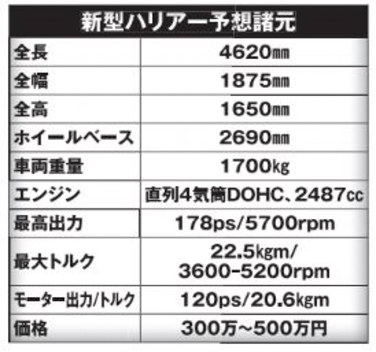 除此之外,现行款 Harrier 所搭载的2.0L四缸涡轮增压引擎也将继续在新一代 Harrier 使用,至于驱动系统方面新车将会是前驱车型,不过 Hybrid 版本则会备有以电动马达形成的 E-Four 电子全驱系统。至于车身尺寸方面,从这家日本媒体所释出的规格列表可以看到,新一代 Harrier 的车身尺码将会是 4,620 mm x 1,875 mm x 1,650 mm,长宽比 RAV4 略大,而车身高度也会降低 40 mm,至于轴距则为 2,690 mm。据悉,新一代的 Toyota Harrier 预计将在2020年月8月在日本正式发表,究竟新车是否真的会长这样,就让我们翘首以待吧!