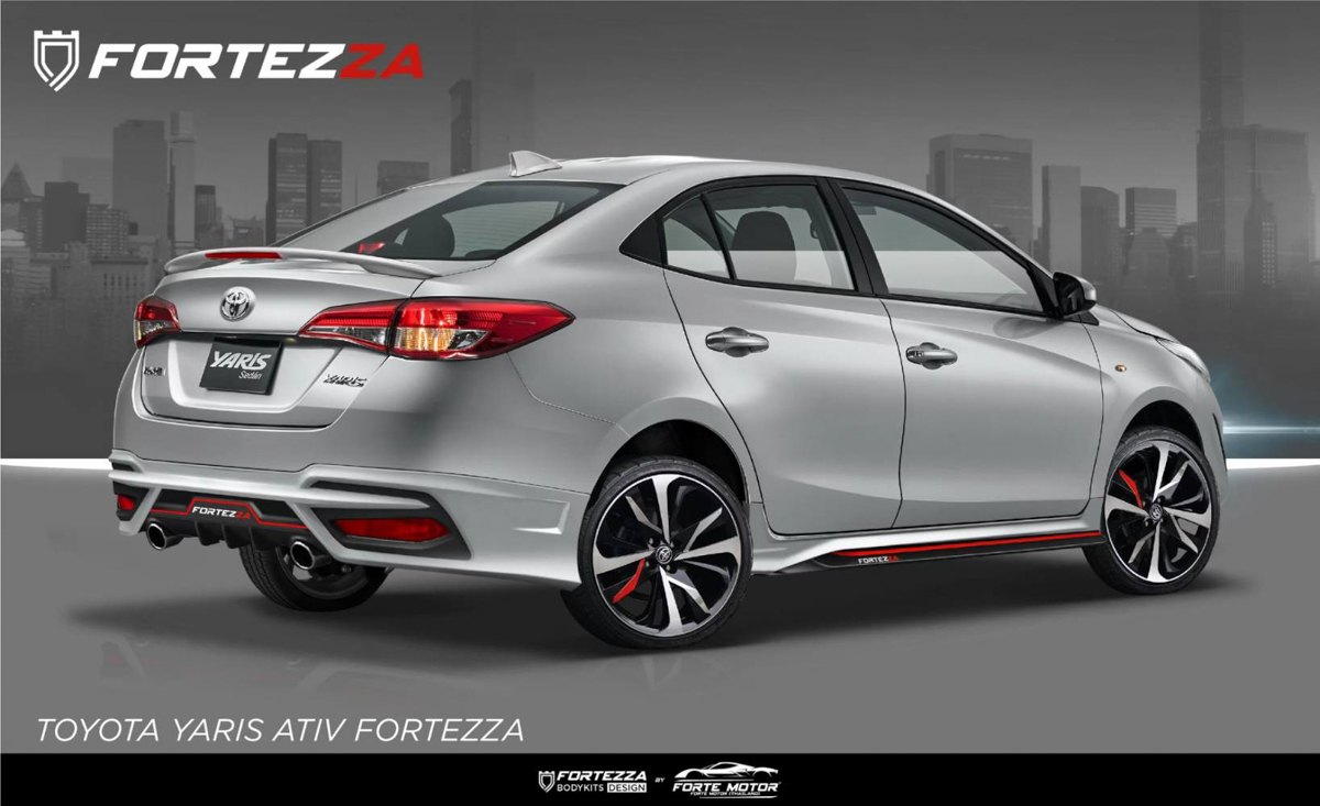 可能很多人会好奇,照片里的车名为 Toyota Yaris Ativ,并不是 Vios 啊!其实 Vios 以及 Yaris Ativ 是一样的,只是在泰国市场,Vios 被称为 Yaris Ativ 罢了,所以大家别误会。我们进入正题,从 R Style 官方图片来看,R Style 这套空力套件名为 Fortezza ,而这次 Fortezza 的空力套件包括了,前后套件,侧裙以及尾翼,而你也可以追加 R Style 为 Vios 所推出的大尺寸轮圈,这套轮圈除了设计更为运动化以外,它还搭配了双色配色的大尺寸轮圈,在轮圈里还可以看到有一条红色的配色,以强调其运动化的身份,非常独特!