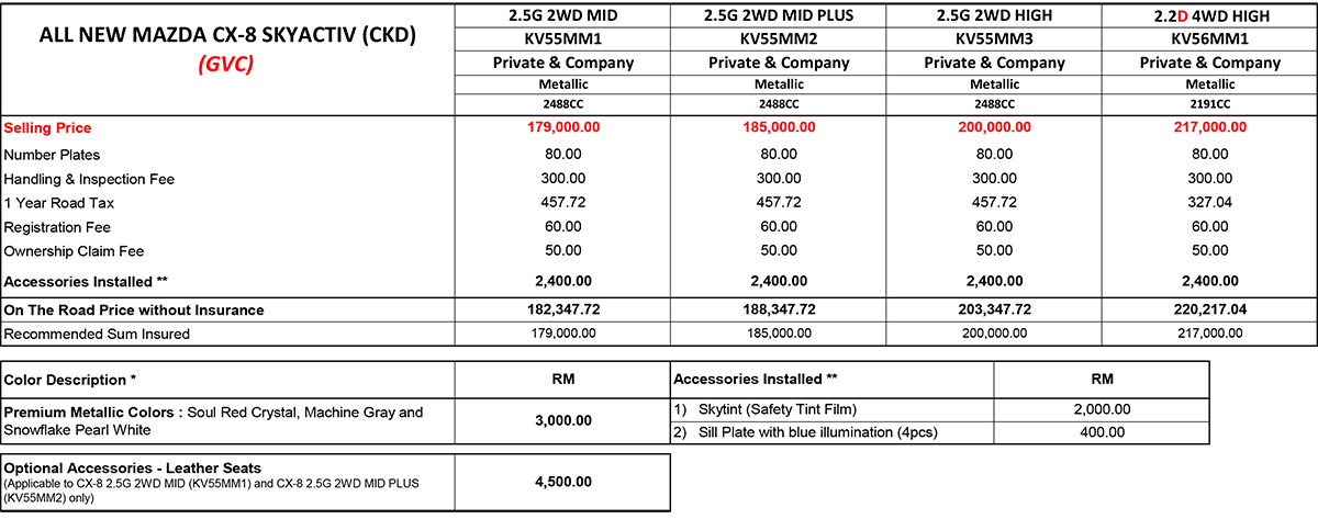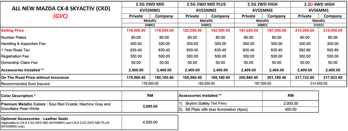 我国的 Mazda CX-8 备有6种车身颜色选择,分别为 Soul Red Crystal、Machine Grey、Snowflake White Pearl、Deep Crystal Blue、Sonic Silver 以及 Jet Black。所有 CX-8 都可享有 Mazda Malaysia 所提供的5年/100,000公里(视何者为先)的保固期以及同样为5年/100,000公里,包含了人工与零件的免费保养配套。