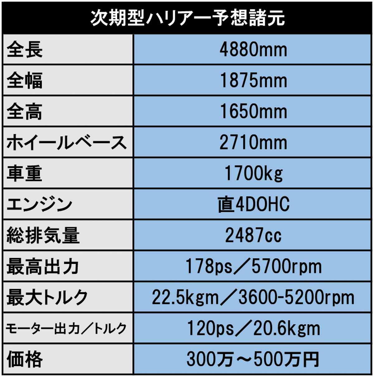 有介于全新的 Toyota RAV4 已经回归日本销售,因此原厂将会把大众家庭 SUV 的市场交给 RAV4 ,而新一代 Harrier 则将会转成定位更精致的豪华运动 Coupe SUV 。根据《自动车情报誌》最新的报道,新一代 Harrier 将采用与 RAV4 一样的 TNGA GA-K 底盘打造,车身尺寸则为 4,880 mm x 1,875 mm x 1,650 mm,其中车长相比之前的4,620 mm可说是增长了不少,据了解是因为原厂计划为新车追加7人座车型,而轴距方面则也将会达到2,710 mm的水准。