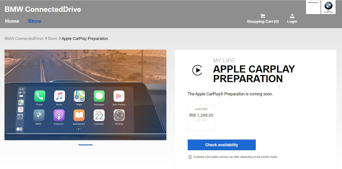 由于 BMW Malaysia 旗下所有的本地装配(CKD)新车本来皆不具备 Apple CarPlay 的功能,这也意味着我国大部分的 BMW 车主必须透过我国 BMW 官网的 BMW ConnectedDrive,又或直接使用汽车主机内建的 ConnectedDrive 线上服务,支付 RM 1,299 来启用 Apple CarPlay 功能。至于原本就内建这项功能的外国进口(CBU)版 BMW 则无需支付任何费用。