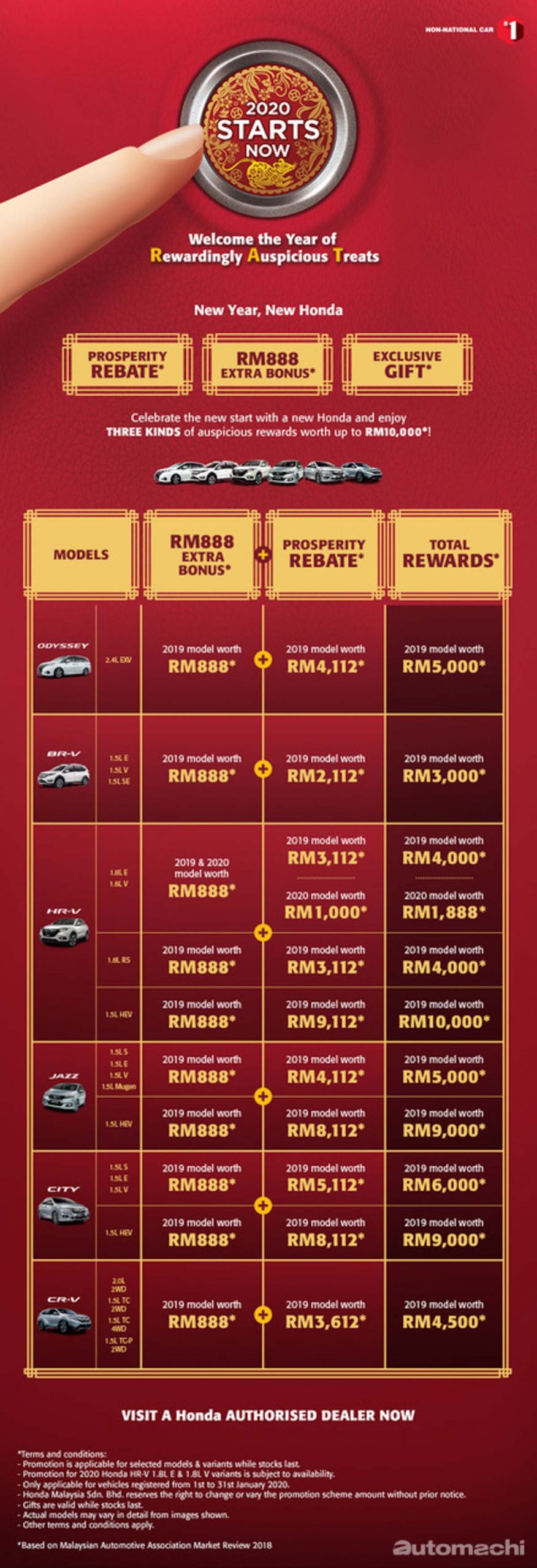 在这次的 2020 Starts Now 活动中,所有消费者都有机会获得三倍的奖赏,总额高达 RM 10,000!这当中就包括购车现金回扣,额外的RM 888奖金以及独家赠品。 想要得到这些好康,你只需要在2020年1月1日至31日期间购买以及注册 Honda 旗下的2019年份新车,车型包括 Jazz,Jazz Hybrid,City,City Hybrid,BR-V,CR-V 以及Odyssey 等车款,就有机会享有这些优惠!