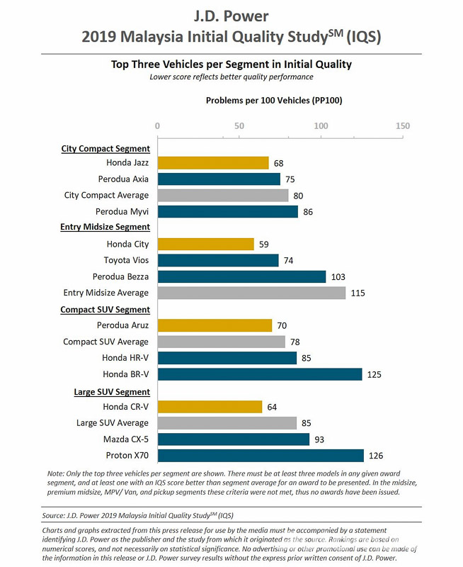 根据 JD Power 公布的2019年汽车质量调查( 2019 Malaysia Initail Quality Study , IQS )中公布的我国四个级距的车款质量排名,其中 Honda 横扫了其中三项的冠军,至于在我国热卖的 Proton X70 则是在这项质量调查报告中排名垫底。