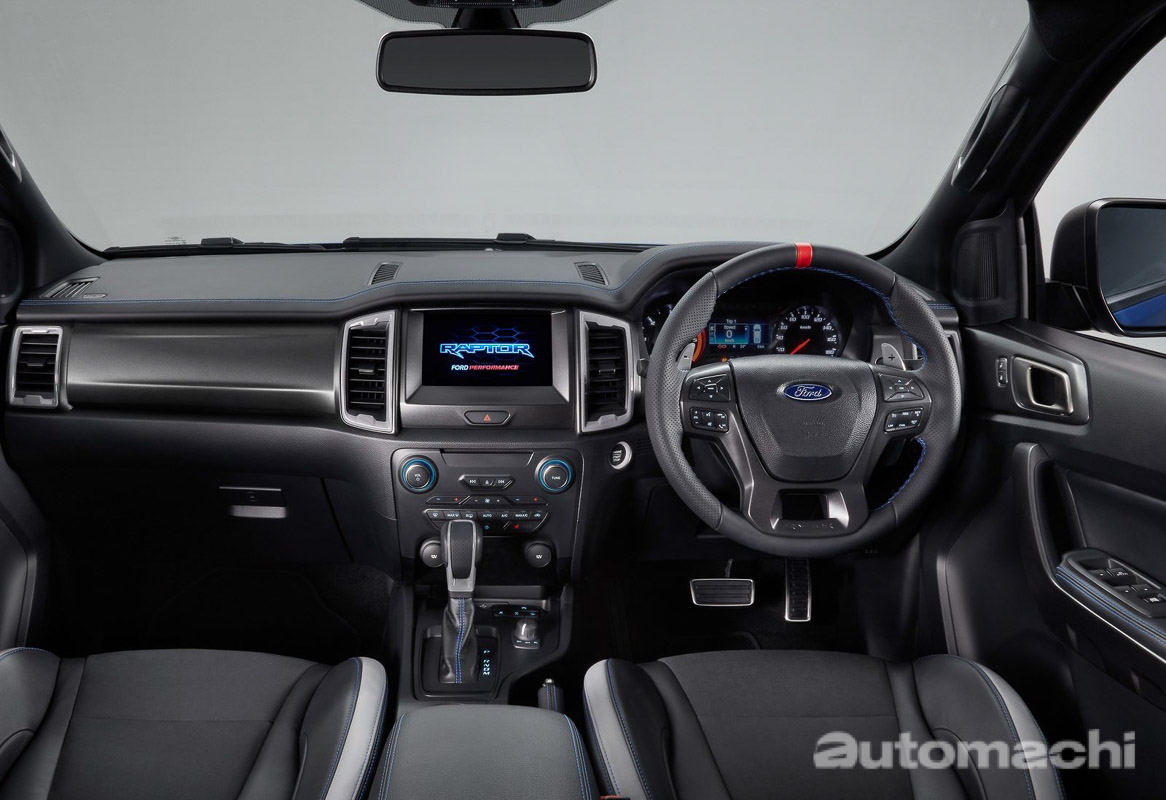 内装方面 Ranger Raptor 和小改款之前的 Ranger 并没有很大的差异,首先我们可以看到在 Ranger Raptor 的椅子上有着 Raptor 的字样,而在开门后也可以看到在地板上有 Ford Performance 的铭牌,因为这辆车就是由 Ford Performance 所精心打造的。另外 Ranger Raptor 的仪表也同样经过精心设计,只是在当时 Ranger Raptor 的先进主动安全配备几乎为0,而这一次 2020 Ranger Raptor 则有可能搭载这些缺失的先进安全配备!因为在去年已经在泰国登场的,而2020年式的 Ranger Raptor 配备了自动紧急刹车,车道偏移警示和前方撞击预警等等。