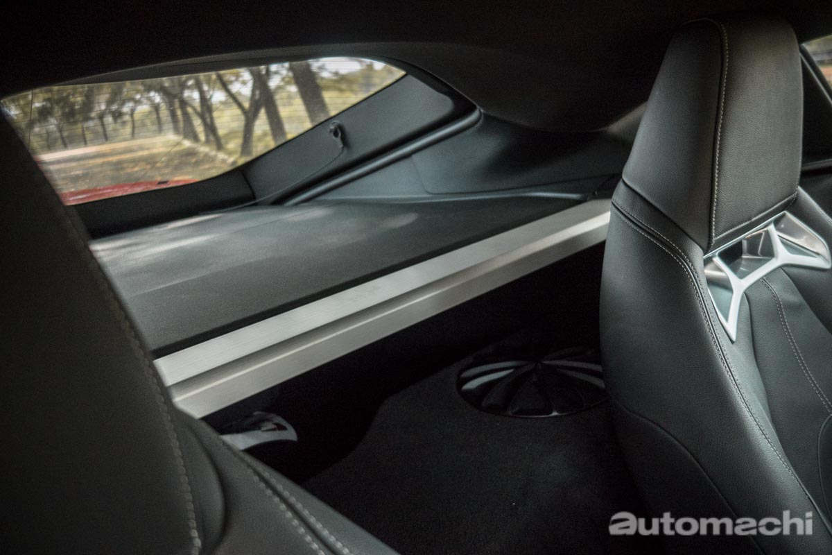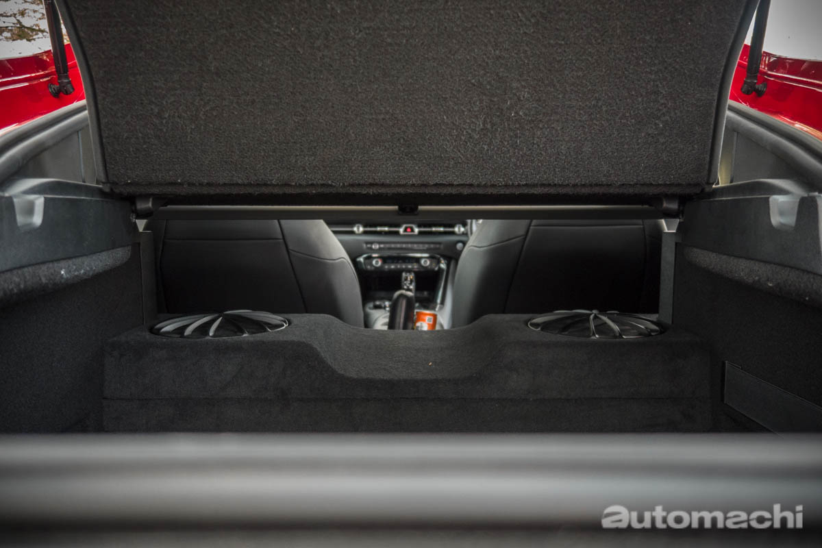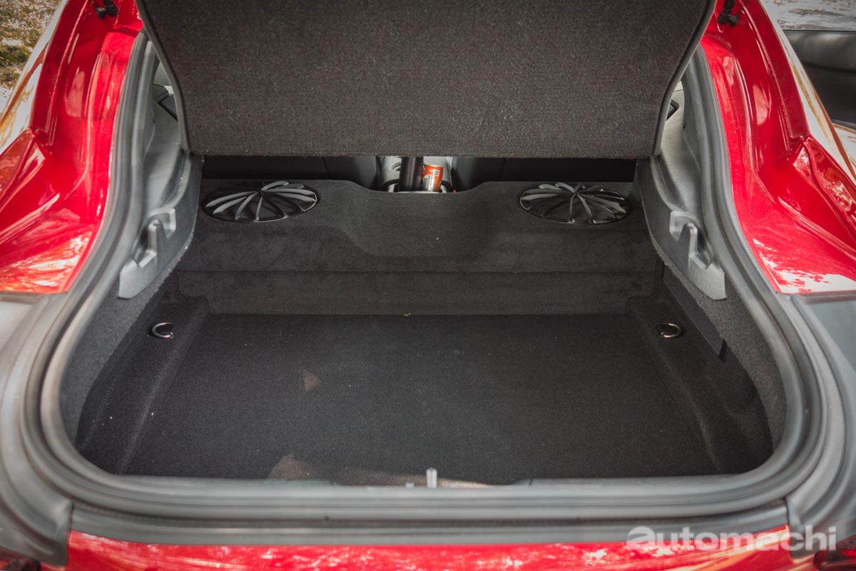 虽然是热血的双门跑车而且车长还异常紧凑,但是 GR Supra 整体的乘坐空间表现还算是充裕的,而且内部的置物空间也相当丰富,除了有杯架以外还有具备固定架设计的无线手机充电插座,你在激烈驾驶时也不必担心手机会抛掉。有一点比较特别的是,Supra A90 的车尾厢是直接和车室贯通的,造型漂亮的电动调整桶椅的后方有支异常粗壮的拉杆,而下方则可以看到一对 JBL 的低音喇叭,而这对喇叭中间还有一个通道,可以让你直接将你的物品放入尾箱,而尾箱的容量以一台跑车来说,算是相当充足的了。