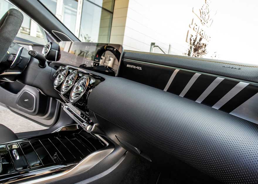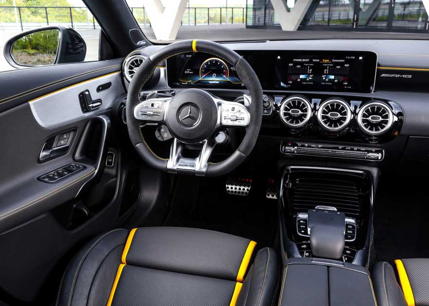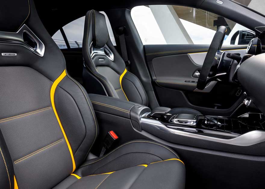 内装方面,同样的还是延续了 CLA 普通版本的设计,只是在方向盘的设计还有面板的材质上做出了改进,这个方向盘是沿用自 AMG 4 Door Coupe 上的设计,不仅手感很佳而且上面还有非常便利的彩色引擎驾驶模式切换键,实用方便之余逼格也满满,不过比较可惜的是上一代 CLA45 车型上还有传统的排档杆,可是这一代的车型的排档杆和普通版本一样位于方向盘的后方,如果你不曾开过 Mercedes 的车款那么你还是需要时间去适应一下,但好处就是 AMG CLA45 S 的内装科技感十足,再加上炫酷的气氛氛围灯,坐上去真的会不想下车啊!