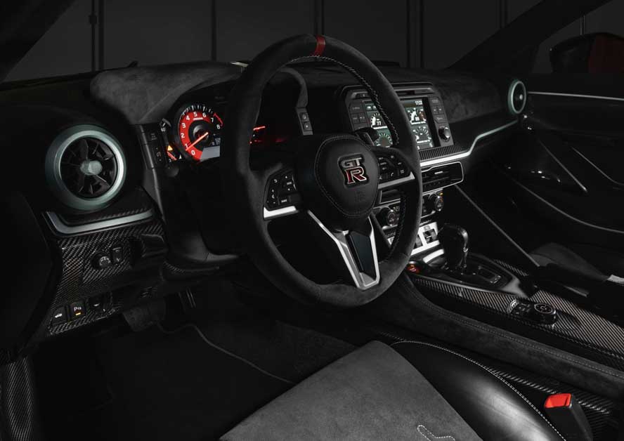 至于内装部分,量产版的 GT-R50 相比起概念版则变得务实了许多,原厂选择沿用了现行款 GT-R 的中控台设计,但是却以大量的碳纤维饰板以及 Alcantara 绒面皮革进行点缀,分布在中控台、仪表板以及门板等部分。当然作为尊贵的限量版车型,Nissan 也让所有 GT-R50 的车主可以根据自身喜好自由定制内外配色以及饰板材质,打造出独有的专属感。