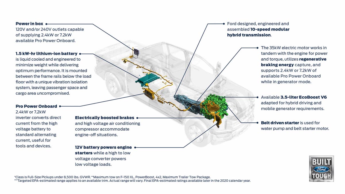 引擎方面 2021 F-150 依旧保留了多种引擎选项,包括了2.7L和3.5L的 Ecoboost V6 引擎,5.0L的 V8 自然进气引擎以及3.0L的V6柴油引擎等等,最特别的是这一次 2021 F-150 还采用了名为 PowerBoost 的混合动力系统,这套系统采用了3.5L的 EcoBoost 引擎搭配混合动力系统,匹配10速的自排变速箱。
