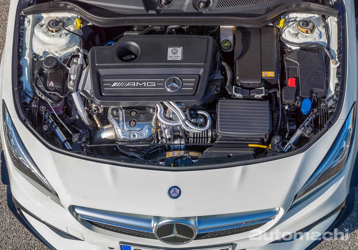 2013年推出的初代 CLA 为了庆祝当 AMG 部门的45周年生日,因此所有的 NGCC ( Next Gen Compact Car )家族都推出了名为 45 的性能车系列,这个系列搭载了一具 AMG 工程师亲手打造的2.0L涡轮引擎,一开始的引擎输出为355 Hp/450 Nm,之后在2017年小改款后引擎动力提升到了375 Hp/475 Nm,在当时来说有着这样的性能已经是非常出色了,加上 AMG 特别调校的 4MATIC 系统因此这款车有着相当卓越的动态表现。