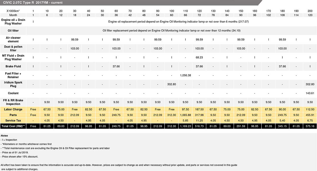 首先就来说一说普通保养的费用,根据 Honda Malaysia 在官网上所释出的信息,Civic Type R FK8 所使用的是 0W-30 等级(!)的引擎润滑油,价格为 RM 217.07。比较特别的是和搭载 1.5L 涡轮增压引擎的 Civic FC 以及 CR-V 一样,Civic Type R FK8 的机油并没有固定的更换哩数,而是根据引擎内置的机油感应器来鉴定,一旦系统侦测到你的机油已经开始变质,就会透过仪表盘的警示系统来提醒你,不过值得一提的是原厂提供的机油最长使用期限为6个月。这一方面呢,其实就看你的驾驶方式如何了,越激烈的话就越早更换机油。至于机油滤芯则是 RM 34.10,这样的价格以一辆高性能钢炮来说,其实不贵嘛!