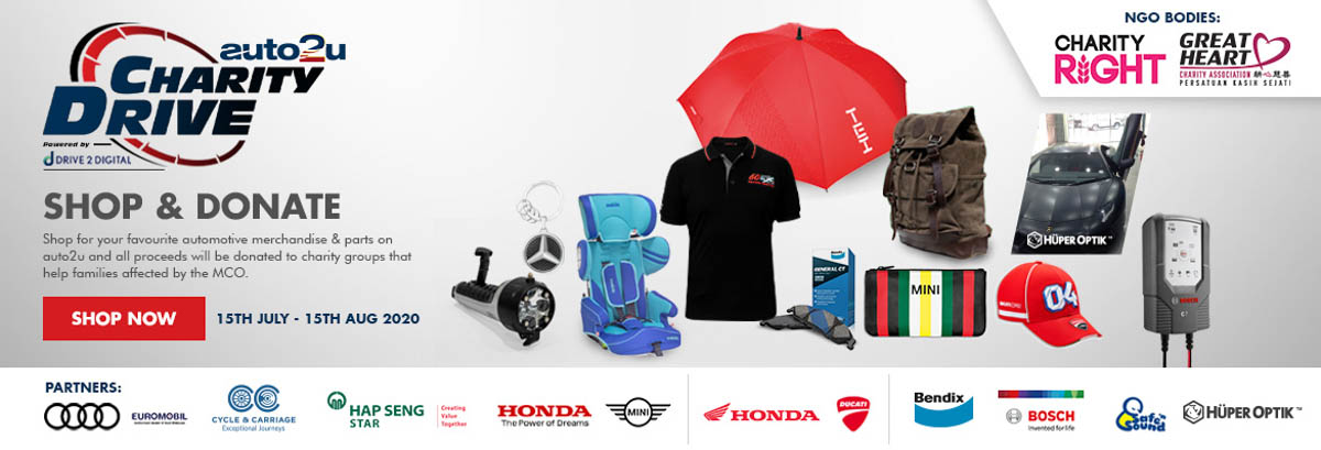 从2020年7月15日起到2020年8月15日,一切从 Auto2u 网站获得的收入在扣除邮寄费用之后会全数捐给 Charity Right Malaysia 以及 Great Heart Association Malaysia 两家慈善机构作为慈善基金,在这段期间内有不少家庭或者是人士因为行动管制令(MCO)而经济陷入困境,而这些家庭或者是人士可能需要医疗或者其他的援助,因此需要大众的雪中送炭,而这些捐款可以给予有需要帮助的家庭以及人士帮助,以期可以帮助他们度过这一个最为困难的时刻, Auto2u 以及三大平台也希望借此为需要帮助的人们送上一丝温暖。