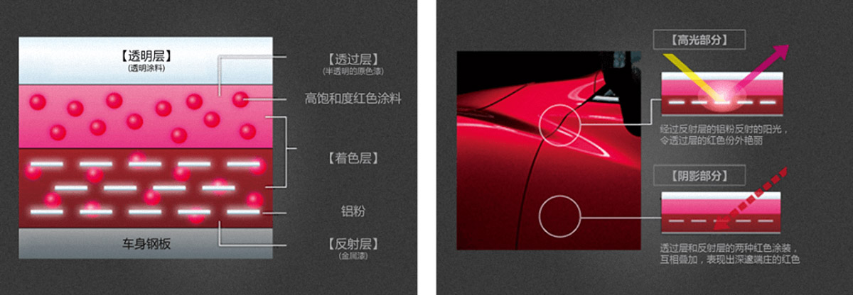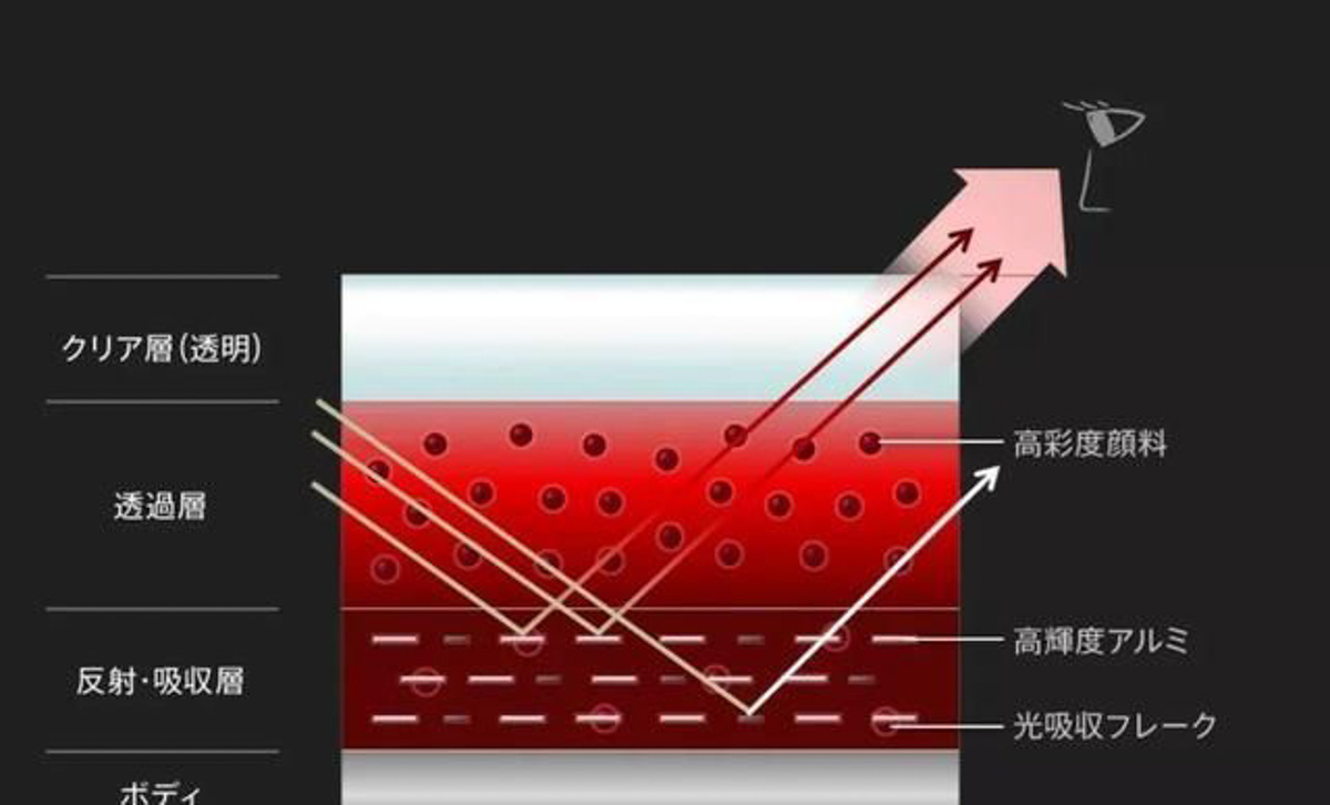此外,工程团队也在反射和吸光层中加入了直径仅为12~15um的高亮度铝粉和吸光粉。高亮度铝粉会将透射过高饱和度红色涂料的光线反射到人眼中,而吸光粉则能起到加深阴影的效果。通过对涂料成分的精密配比,车身漆面的视觉效果会随光线变化产生微妙的动态变化。因此,无论是高光的艳丽还是阴影的深邃,都能拿捏得恰到好处。