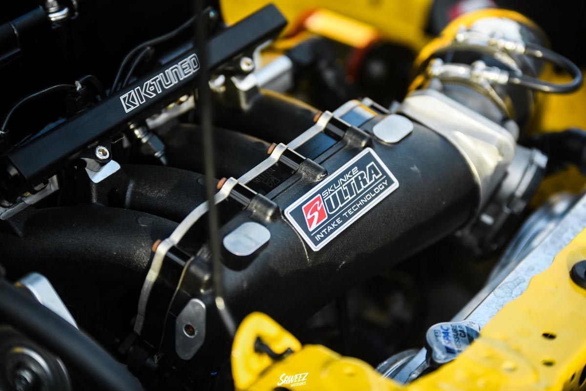 当然全车亮点自然还是在同样干净的引擎室里那具低调的 K24 VTEC 自然进气引擎了,从照片上也可以看出这具引擎已经不再原装,车主为其进行了许多强化和升级,包括换装 Toda 的活塞、连杆、凸轮轴、气门弹簧、阀门、气缸垫一系列改装部品,还有 Skunk 的进气歧管,以及可口的 K Tuned 1,000cc 喷油器和油轨等等,并搭配 Integra DC5 的6速手排变速箱,而在 ECU 方面也是不再使用原装电板,而是改用 MoTeC M800 的改装电板,而油供方面也换上了 AEM 的高压油泵。