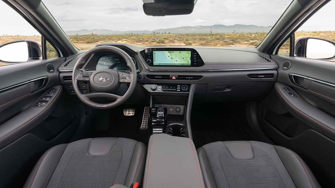 内装部分,原厂并没有做出很大的改变,只是导入了大量 Alcantara 材质作为点缀,同时座椅也带有 N Line 标识,并且是全 Alcantara 的搭配,而其内装也采用了全黑的风格+红色缝线,彰显运动气息。至于像是原本普通版 Sonata 上的四幅式方向盘,液晶仪表,大尺寸娱乐主机,按钮式排挡杆等都没有缺席,只能说 Sonata N Line 既运动又奢华。