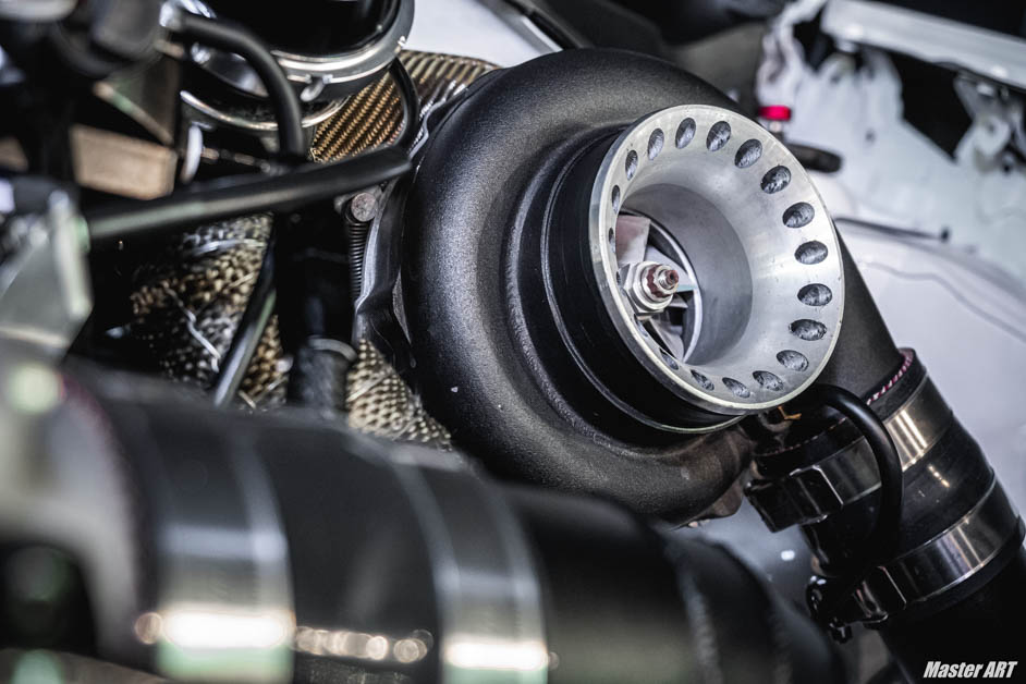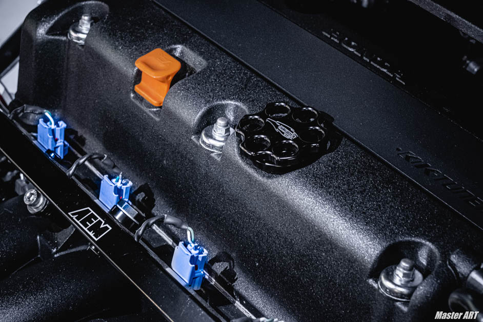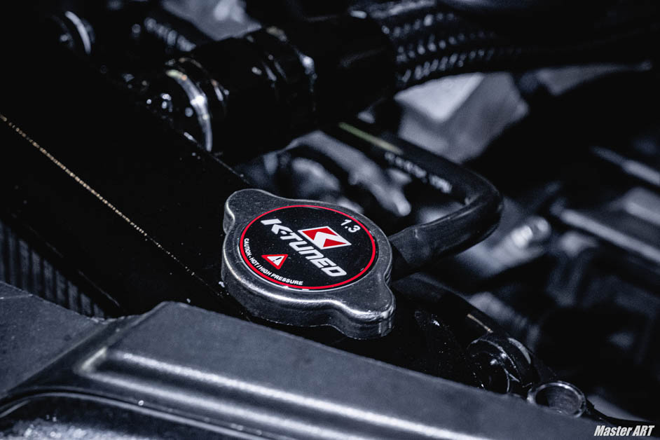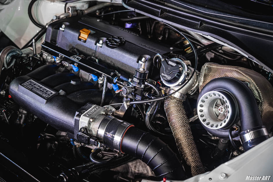 但打开碳钎维引擎盖,里面躺着的是代号为 K24 的 大 VTEC 引擎!不但如此,车主还为其加装了尺寸超大的涡轮增压系统,同时采用了 Turbo Smart 的 HyperGate 45 泄压阀,以及 K-Tune 的引擎升级套件,包括了水冷系统,进气系统,活塞,连杆,凸轮轴,气门弹簧,阀门,气缸垫一系列改装升级品,势必将引擎的极限推到最 MAX!