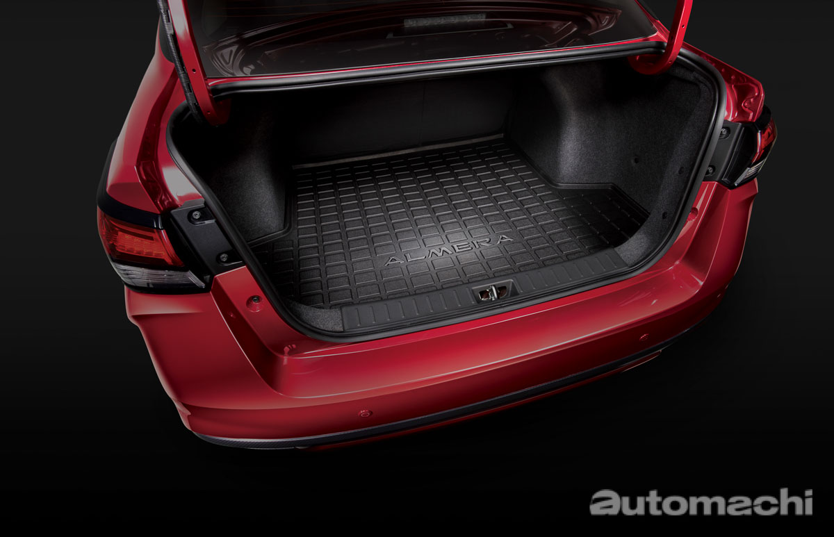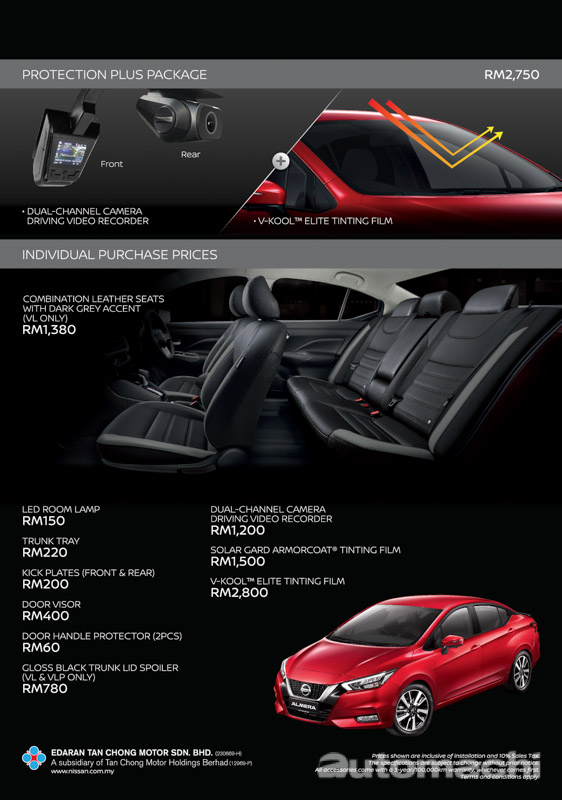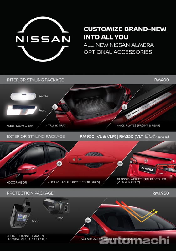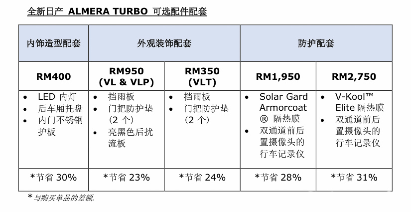 可选配件配套是专为那些希望拥有个性化风格的全新日产 Almera Turbo 车主而量身定制。每个配件均提供3年保修,并可在订购日产 Almera Turbo 时一并贷款。有4种配件配套可选。第一种是价值RM 400的内饰造型配套 ( Interior Styling Package ) ,这个造型配套含 LED 内灯、具有防滑表面的后车厢托盘(可防止货物滑动、保持后车厢清洁、防尘和泼洒)以及安装在前后侧内门蚀刻 Almera 标志的不锈钢护板(防止刮花磨损)。